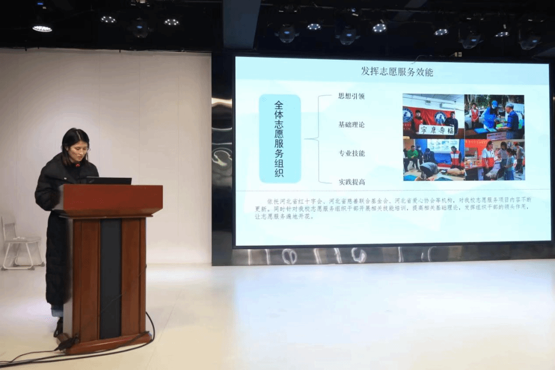 随后,校团委志愿服务指导中心主任李昕翰上台分享工作经验及工作计划,讲述了在参加“公益大篷车”、“为爱奔走三小时”、金晖助老、“三点半”爱心课堂等活动时所了解的社会现象,总结了志愿服务学到的知识和技能,并代表广大志愿者向大学生提出倡议,呼吁大家锻炼社会实践能力,积极参与社区实践活动。