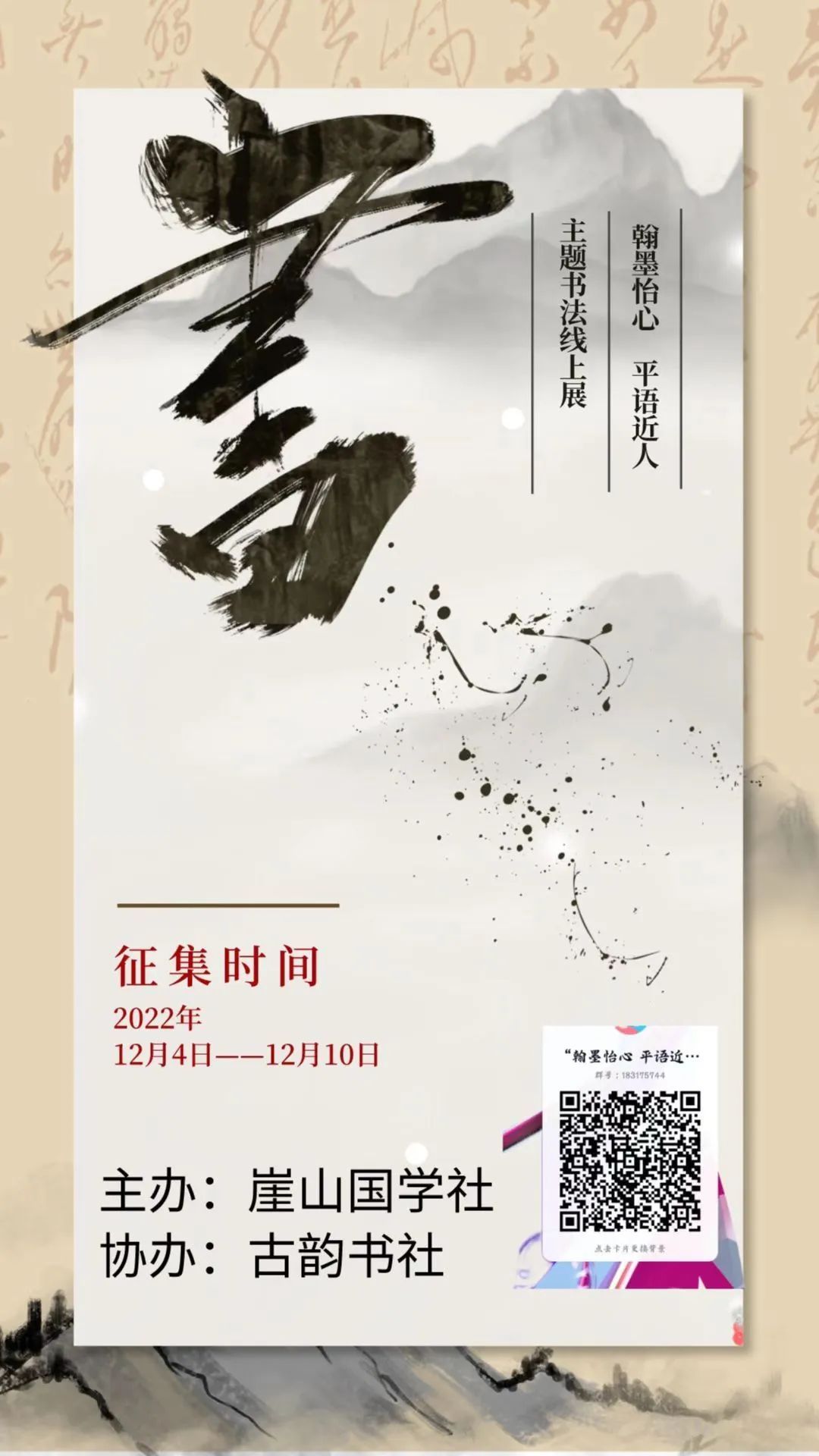 为了深入学习贯彻党的二十大精神和习近平总书记重要讲话精神,增强学生的爱党爱国意识,引导大学生永远听党话、跟党走,增强大学生对书法文化的兴趣,提升学生的创作思维,弘扬中华传统文化,丰富大学生的课余生活。特此,崖山国学社举办此次“翰墨怡心 平语近人”主题书法作品线上征集活动。