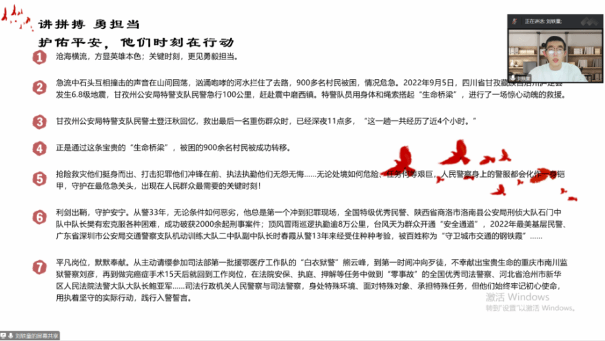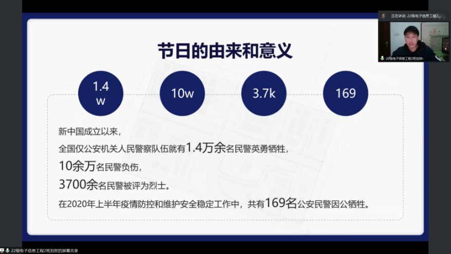 会议中,首先由工作人员有序组织参与人员进入腾讯会议,接着相关宣讲人员按顺序开始宣讲,宣讲的内容包括人民警察的日常工作、日常训练、出警任务、守卫工作等等多个方面进行了详细的介绍,生动的展示出人民警察的形象与人民警察精神,最后相关的负责人对本次线上活动做最后的总结工作,做出启示与参悟,表明意义与重要性。