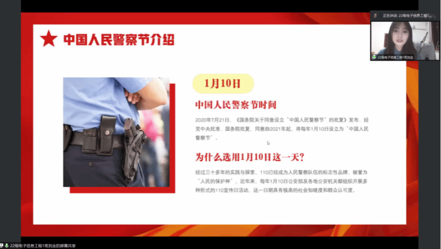 为了弘扬人民警察精神,深入贯彻习近平总书记在全国公安工作会议上的重要讲话和在中国人民警察授旗仪式上的重要训词精神,引导学生们体会与领悟人民警察精神,将此精神转化为自我的内生动力,强化自我的精神内核,更好的指导我们学习与生活,为了展示警察形象、密切警民关系,在校园中形成更加崇尚警察职业、更加理解关心支持人民警察工作的良好氛围,让人民警察的形象在我们脑中更加立体、更加深刻。特此,网络与通信学院学生会于1月10日线上举办“红心向党,警旗飞扬”主题宣讲活动。