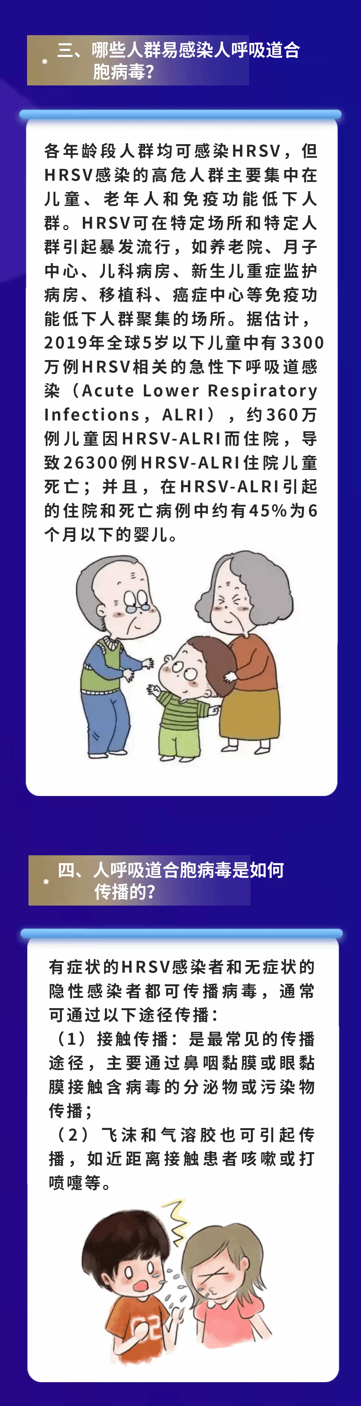 首先要注意,感染过HRSV也不能形成永久免疫,之后还可能多次感染。它是婴幼儿肺炎、毛细支气管炎最常见的病因。全球每年约有3310万例5岁以下儿童HRSV引起的急性下呼吸道感染新发病例,其中约10%需要住院治疗,约2%-5%住院患儿死亡。低龄儿童以及60岁以上老人感染后更易发生重症。