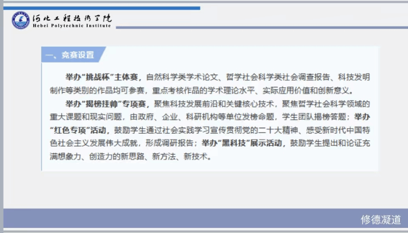 春暖花开,万物复苏,春天的力量永远比我们想象的更加蓬勃,我们楚美她、期待她、迎接她,而在这个春天,为了丰富同学学们的课余文化生活,为进一步提升我院学生课外学术科技创新项目的水平,同时,为参加2023年河北省“挑战杯”大学生课外学术科技作品竞赛做准备,特决定在全院范围内开展2023年河北省“挑战杯”大学生课外学术科技作品竞赛项目的征集布望同学们在这个充满生机与力量的季节里昂扬向上,在今后的生活中熠熠生辉。特此,我建筑与设计学院的社团联会举办开展2023年河北省“挑战杯”的启动仪式。