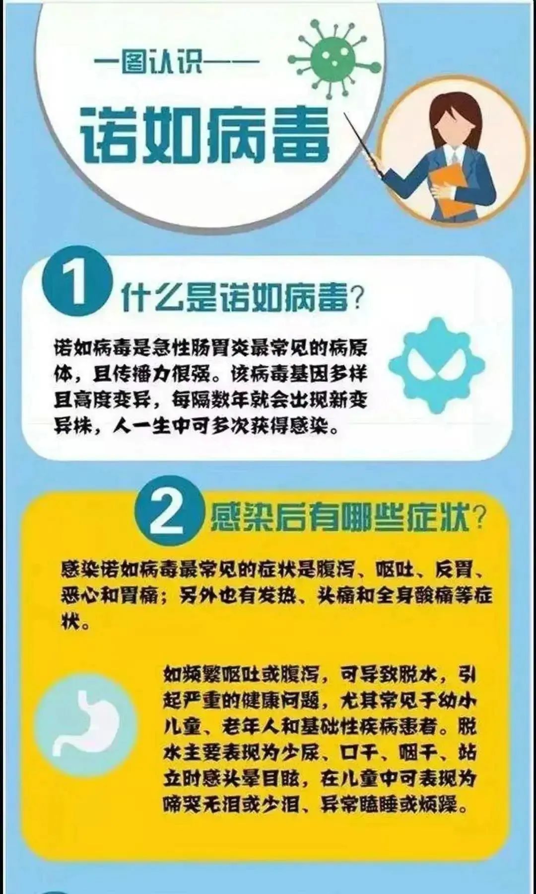 诺如病毒感染会引发诺如病毒感染性胃肠炎,患者出现呕吐、腹泻、恶心、腹痛、发热等症状,呕吐、腹泻严重者,还可能发生严重脱水,导致死亡等严重后果。一旦出现恶心、呕吐、腹泻等症状时,应警惕自己是否感染诺如病毒,并及时前往医院检查。当患者病症严重,出现尿量减少、口干、眼干、困倦无力、焦躁不安等症状时,应警惕是否发生严重脱水,随后立即急诊就医。
