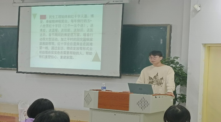 红十字会是党和政府在人道领域的助手和联系群众的桥梁纽带,服务困难群众是红十字会的生命线,为弘扬“人道、博爱、奉献”的红十字精神,推动党史学习教育,为了我院学生了解更多有关自救互救的能力和急救相关方面的知识,构建校园安全体系,特此,土木工程学院大学生志愿者协会于4月30日在主教3-1教室开展,“三救三献,救在身边”主题宣讲活动。
